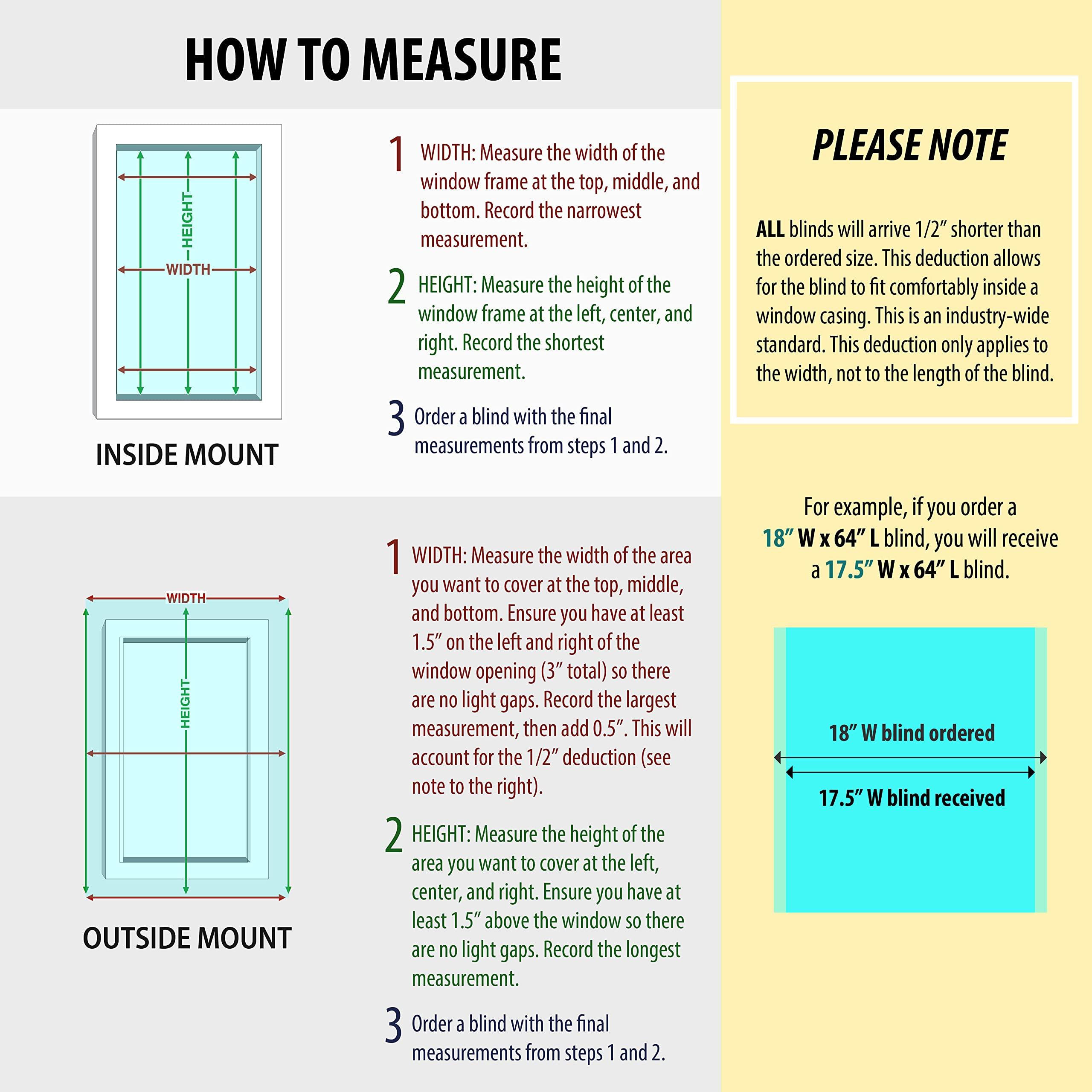 - WHAT SIZE TO ORDER: This blind will be exactly 59.5 inches wide to ensure the perfect fit inside a window frame that is 60 inches wide. All Lumino blinds are precision-cut to be " narrower than the ordered width, providing the ideal inside mount. Please measure carefully see image with instructions to ensure the optimal fit. The sizes listed are WIDTH x HEIGHT.