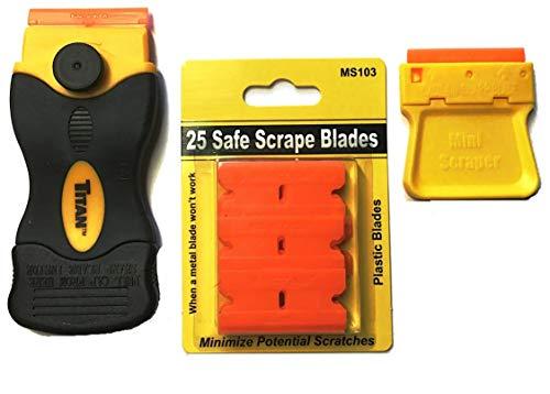 Two scrapers , 27 Blades with dual Edges . Compact Mini Scraper, Scrapers accepts all standard single steel and plastic razor blades.. The Extra Strong Titan Scraper with protective cap is ideal for scraping labels and decals from glass, windshields, etc. Comfortable rubber handle for maximum grip. The Safe Scrape Double Edged Plastic Blades are ideal tools for scraping away unwanted materials without the worry of damaging the surface , Sharp Edged , Plastic Razor Blades can be used on a variety of surfaces and detailing jobs. These double-edge blades are completely safe on most surface, but are much sharper than most plastic blades. The blades are used for scraping, cleaning and peeling debris from most surfaces and where a metal blade isnt appropriate. Durable and Safe. Pointed edges handle with care, handle safely,wont cut . Mini Scraper color may vary. 54 Usable Edges.