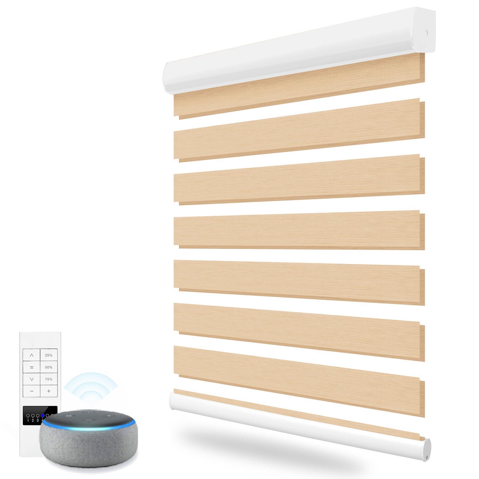 - Dual-layered Design: 80% Blackout,the automatic blind is made of blackout polyester and sheer fabric that is designed to provide privacy while still allowing light to enter the room. Double layer zebra shade combines alternating sheer and solid fabric bands in horizontal stripes, by remote control adjusting the density of indoor light, isolate the external line of sight to ensure indoor privacy. Close blinds to block harmful UV rays. 50% open to enjoy soft indoor light. Open to enjoy indoor sunshine.