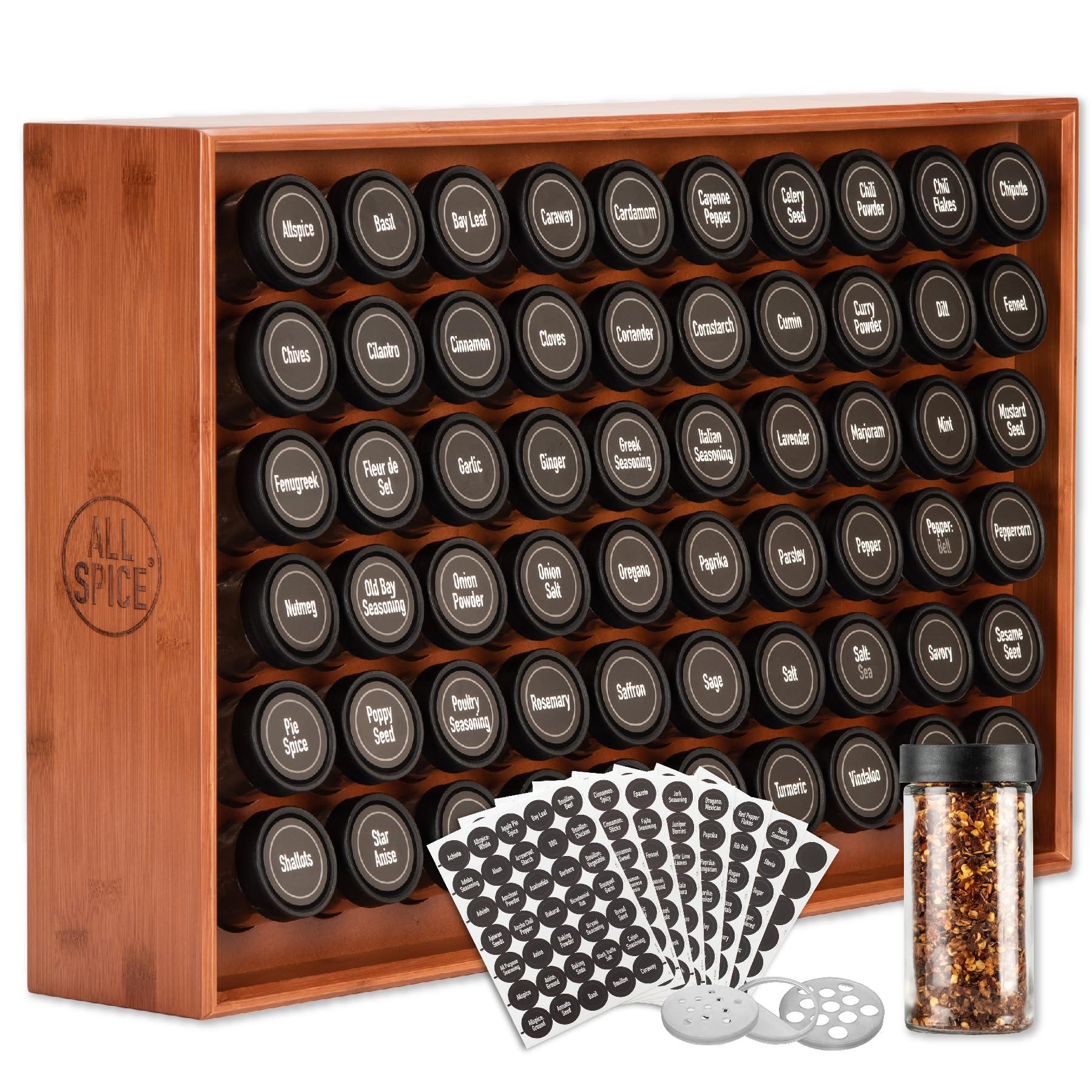 - 60 Jar Spice Rack Organizer - Simplify and elevate your herbs, spices and seasonings organization with an AllSpice Wooden Spice Rack. Complete with 60 4oz / 1/2 c refillable empty glass jars and three lid variations, including shaker and scraper tops