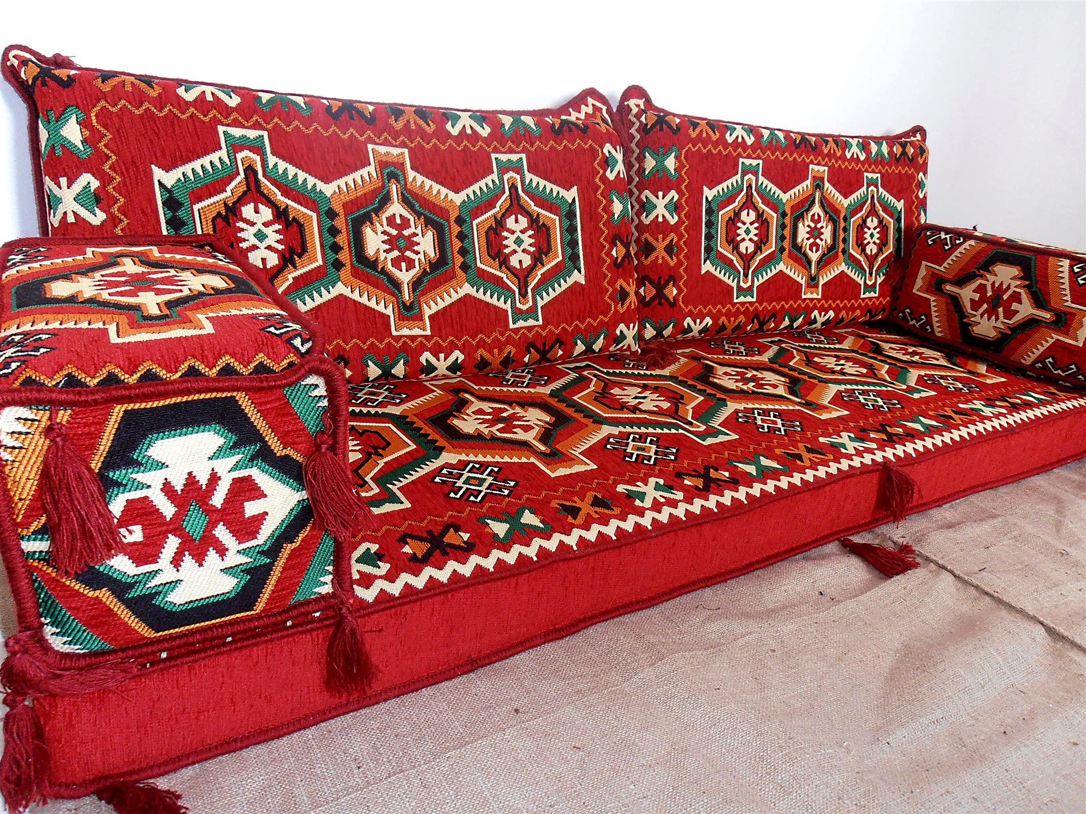 This floor sofa set comprises 5 individual pieces; 1 floor seating cushion, 2 backrest pillows and 2 armrest pillows All parts of the set includes their inner fillings/ inserts ( you will receive both the covers and their interior foam fillings after your purchase ) Both sides of all covers made from a long-lasting heavy fabric with the same design has embroidered/printed on all sides Comfortable for both sitting and sleeping on Perfect for creating a cozy and welcoming atmosphere in your home Ultimate comfort companions for your family as well as for your pets Perfect for a bohemian or an ethnic home interior Excellent for living rooms, children's rooms, conservatories, hallways, balconies, offices, hotels, cafeterias, yachts etc. Please note that these sofas aren't free standing, therefore they need to be put against a wall or similar structure for back support