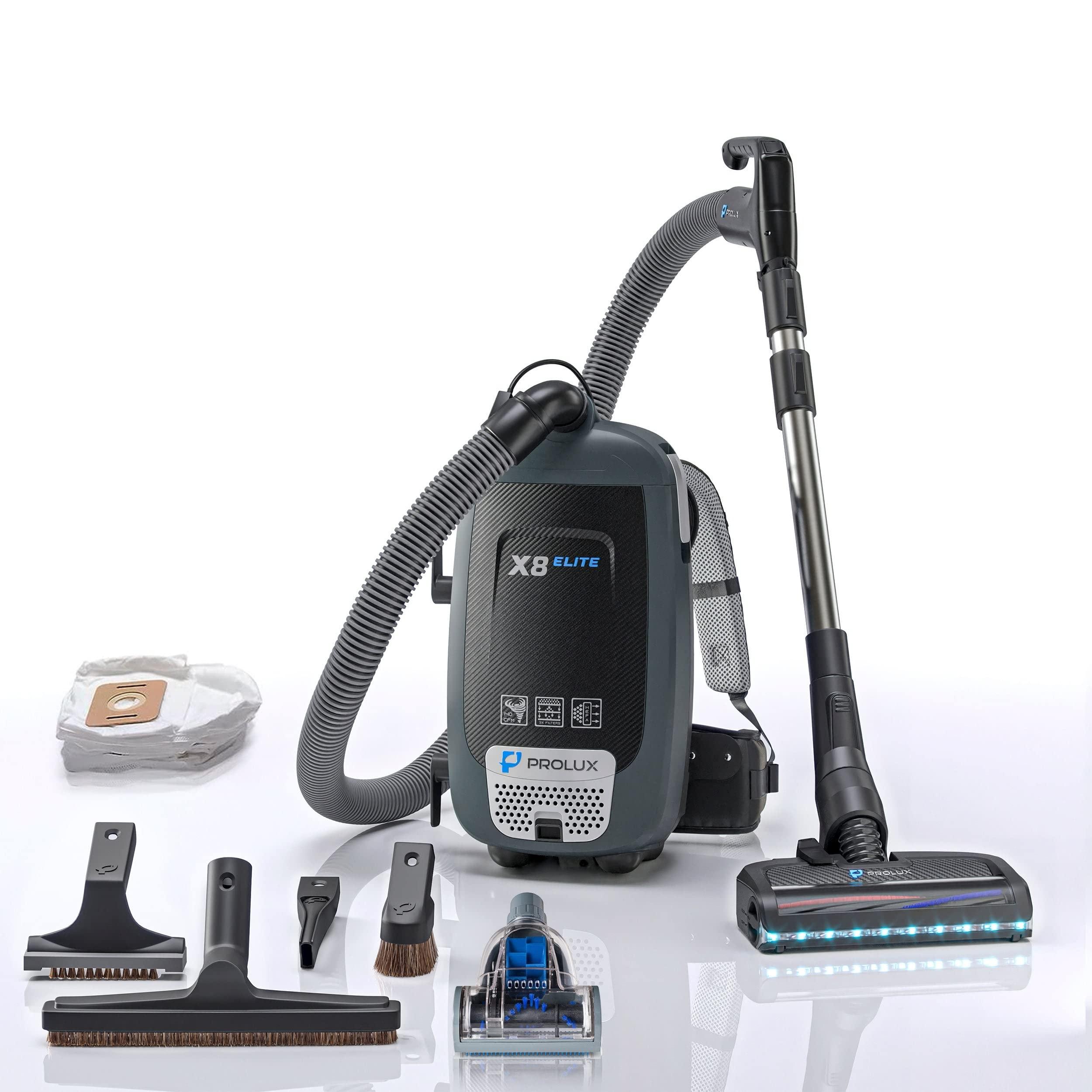 - Prolux X8 Backpack Vacuum - Ten pounds, comfortable carry, premium tools, adjustable straps, and looks just enough like a jet pack that you may be able to talk your kids into vacuuming for you. Convenient - Electric powerhead constructed from the Wessel Werk EBK 250 powerhead can be used equally on hard floors and carpets - without switching. Its slim design and flat construction make it easy to use under furniture. Designed and developed in the USA. Material : ABS