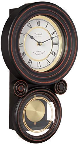 This contemporary wall clock from the Bedford clock collection adds a classic yet modernized appearance to any room. This makes a splendid addition to any home or office with a versatile and unique design. Has 4 chime modes and a volume control toggle. Proudly made with maintenance free, precision quartz movement, clockworks pendulum run on a standard "AA" battery (not included) 4 chime modes, volume toggle, solid black oak finish & plastic case, matte dial with chapter ring accents, wooden case is has gold accent details, dial features roman numerals, polished brass inspired pendulum bob feature adds a classic style to this contemporary piece.
