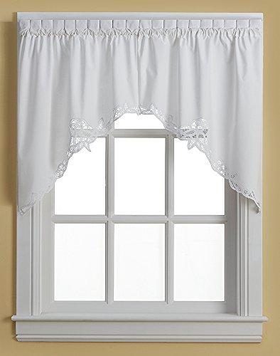 Traditional Battenburg lace swag set features a characteristic open work Battenburg lace design with a scalloped edge. Swags are constructed of 100% cotton and have a 1.5-inch rod pocket for use with a standard curtain rod. Please note: Each swag measures 30 inches wide by 36 inches long. This is a set of two (2).