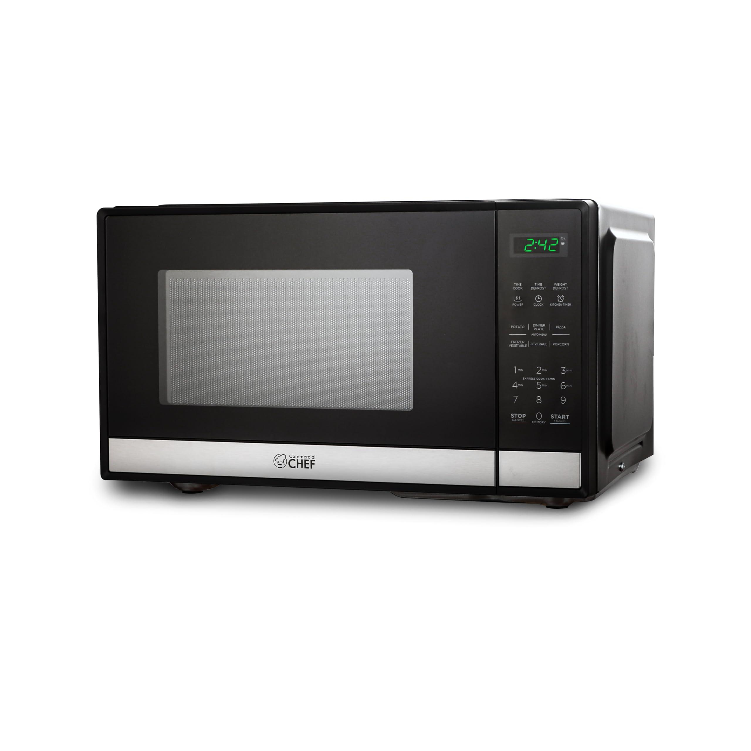 Heat and re-heat your favorite foods and beverages with this outstanding COMMERCIAL CHEF microwave oven countertop. With an impressive capacity of 0.9 cubic feet, this stainless steel microwave with black housing ensures you can grab and go with delicious meals. The appealing and timeless decor of this microwave stainless steel (18.9" x 13.4" x 10.7") will fit easily in your microwave cabinet or kitchen countertop in homes, apartments, RVs, dorms, and more. Weighing only 27.6 lbs., you can transport this microwave 900 watt with digital timer anywhere so heated food and drink is within reach. This microwave small has 10 power levels, ensuring you find the function that works for you, including settings for 6 pre-set menus, and defrost by time or weight. With digital LED controls for all settings, our small countertop microwave will heat from 30 seconds to 30 minutes! Unlike other microwaves, additional features on ours includes a convenient microwave handle, 900 watts of power, child lock, and efficient microwave turntable that guarantees even heating. What's not to love about this COMMERCIAL CHEF microwave countertop 0.9 cu ft? Its reliable heating ability, impressive functions & settings will have you heating and re-heating throughout your busy day!