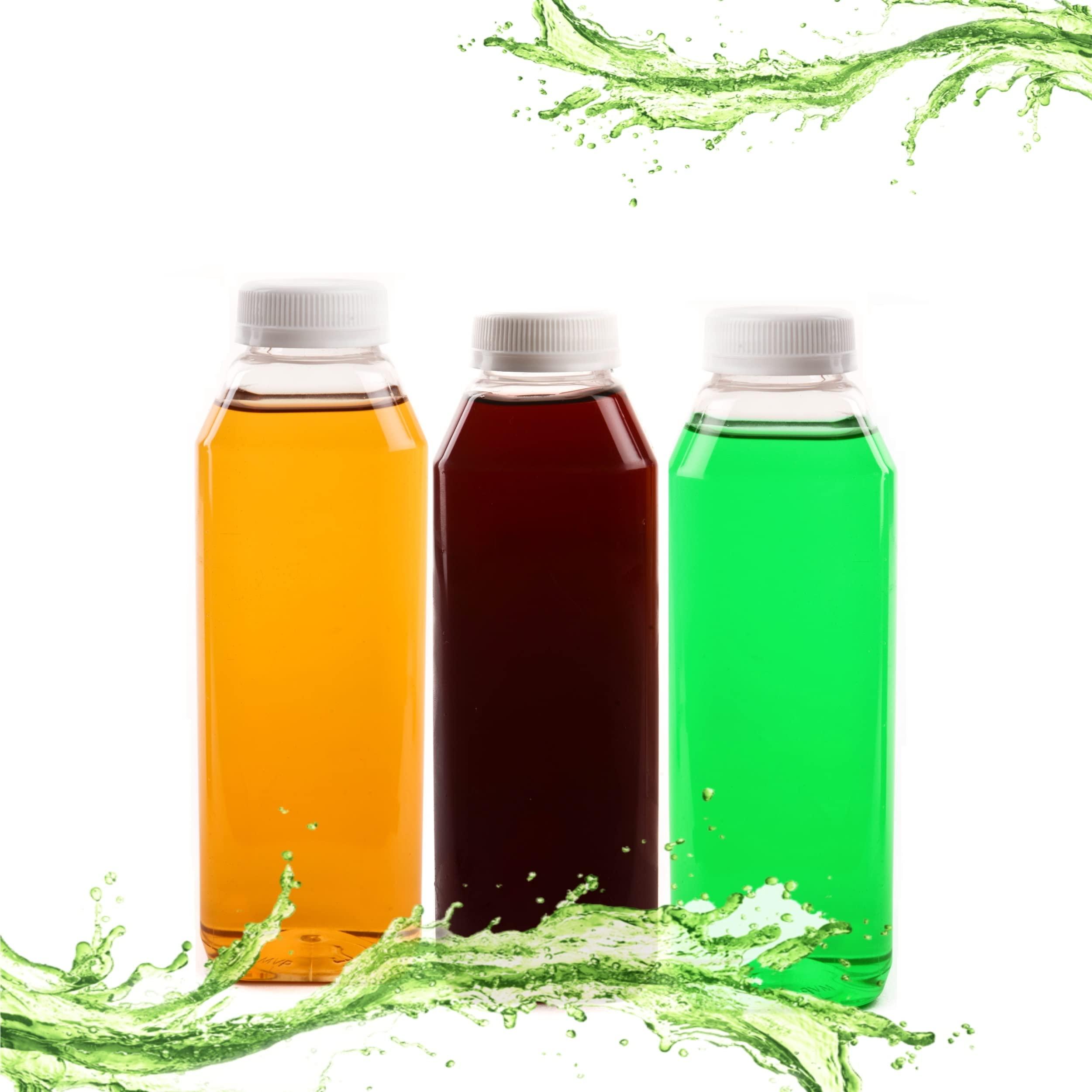 - PLASTIC JUICE CONTAINERS decant larger drinks into our small pint size juice bottles to save money or to enjoy on the go. Theyre ideal for lunch boxes, gym bags, backpacks and picnics. Being square in shape they can be stored easily, and the clear plastic makes identifying the contents and liquid levels effortless