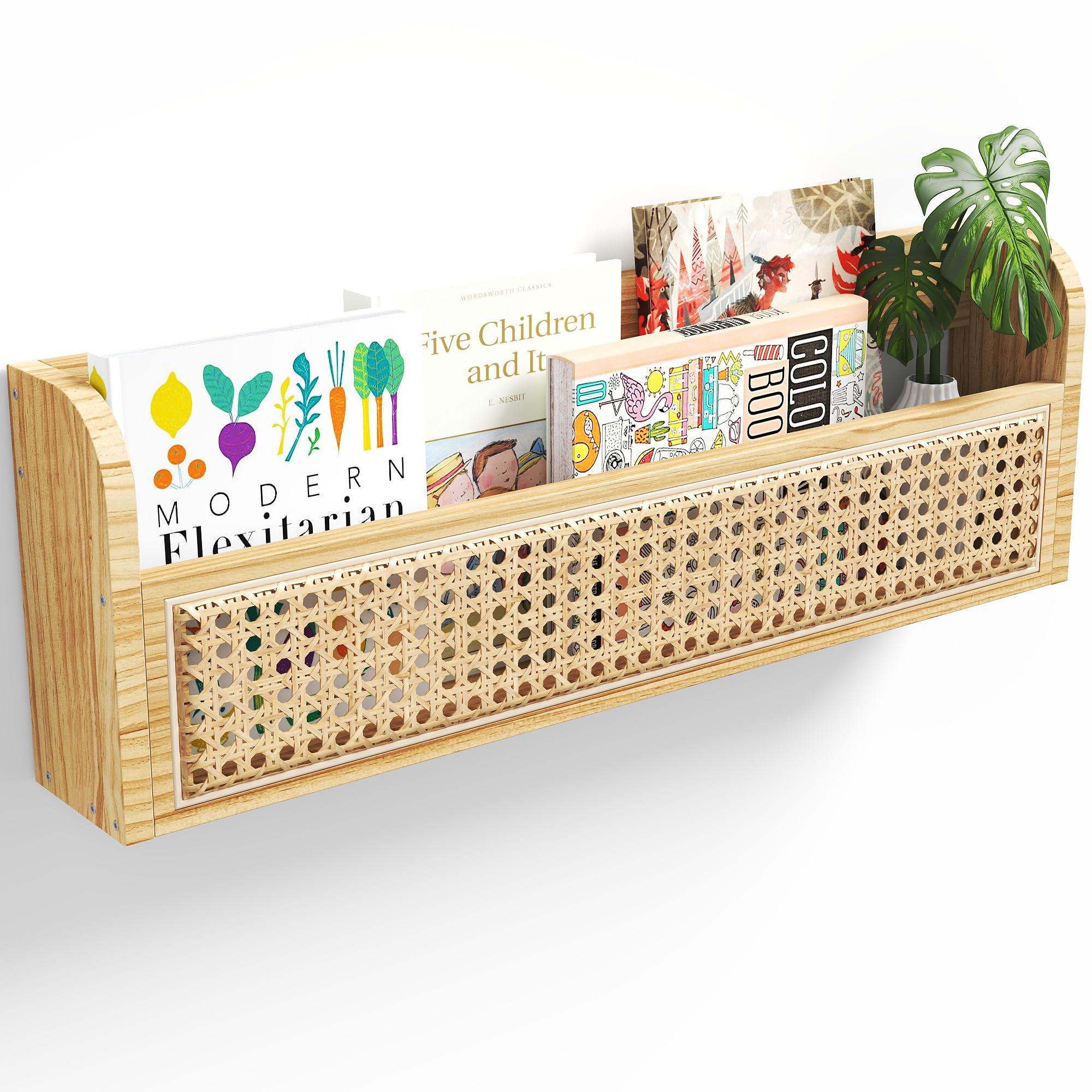 - VERSATILE FLOATING BOOKSHELFThe 24 inch rattan shelf is perfect for home storage and decoration, adding a special element to your home. The wall mounted magazine wall shelf can be placed in the bedroom or living room to store your favorite newspapers, magazines. Its unique rattan texture and cozy wood style create an ideal reading or play corner.