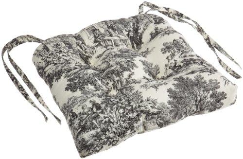 Victoria Park Toile Cushioned Chair Pad--Toile print fabric originated in France in the 18th century and immediately became a popular decorating pattern that still holds true today. The classic country scenes and soft cotton fabric will change and improve the look and feel of any room while adding a touch of style. Made with 100% cotton outer fabric and polyester fill inside you are sure to get a pad thats beautiful and comfortable in a decorating pattern that\'s timeless and long lasting. Constructed into the chair pad is a corded edge and string ties to hold it in place. Decorative and functional tufting was added to keep fill from bunching or shifting giving you years of trouble free use and enjoyment. It Measures 15 inches wide, 14 inches long and approximately 3 inches thick. Cushioned chair pads can be combined with coordinating Victoria Park Toile Tailored Tier Curtains, Tailored Pair Drape Panels with Tiebacks, Valences, Throw Pillows, Shower Curtain, Bed Comforters and Shams that are also available thru Amazon. Made in the USA, Spot clean only