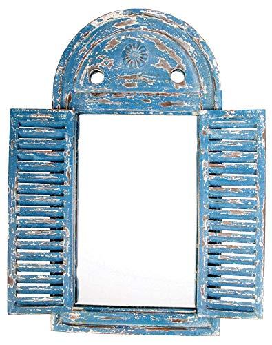 Beautifully distressed arched window frame showcases a mirror behind the louvered French doors. Adds a wonderful rustic touch to your three season room or a covered deck. Also a great addition indoors. Distressed blue finish.