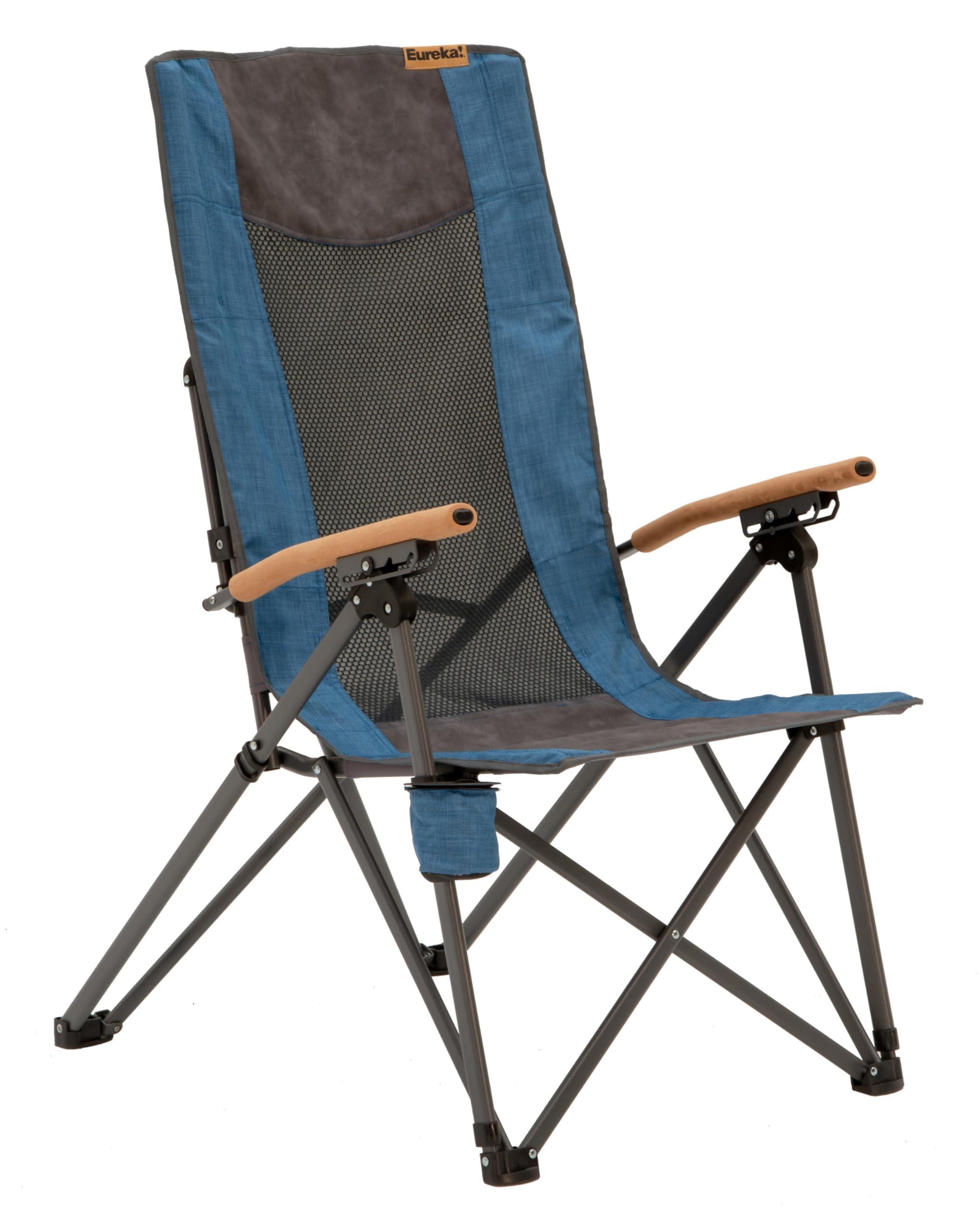 Lean backway backand relax under the sun or stars in the Eureka! Highback Recliner chair. The comfy three-position, 20-degree reclining seat back is perfect for chilling' by the campfire. Designed for day-long comfort, the chair features cork-look EVA foam armrests and a seat back made of faux leather and ventilated mesh. Eureka's rugged steel frame is sturdy yet comfortable, with support for up to 300 pounds. Enjoy a cold one with the Highback's hideaway bottle holder; the seat back collapses for easy packing and carrying. Measures 34" L x 24" W x 46.5" H (open) and 39.5 x 7.5 x 6.5 inches (folded) weighs 12 pounds 4 ounces; includes: Highback Recliner Chair, Carry Bag, Instructions; limited warranty. Ideal for car camping, family camping, tailgating, backyard bbqs, picnics, outdoor sporting events and lounging in the yard. Eureka! found its humble beginnings in 1895 and today their camping gear gives you the freedom to have fun - from tents to cooking systems, and sleeping bags to camp furniture - reliable, easy-to-use, and packed with features campers care about.