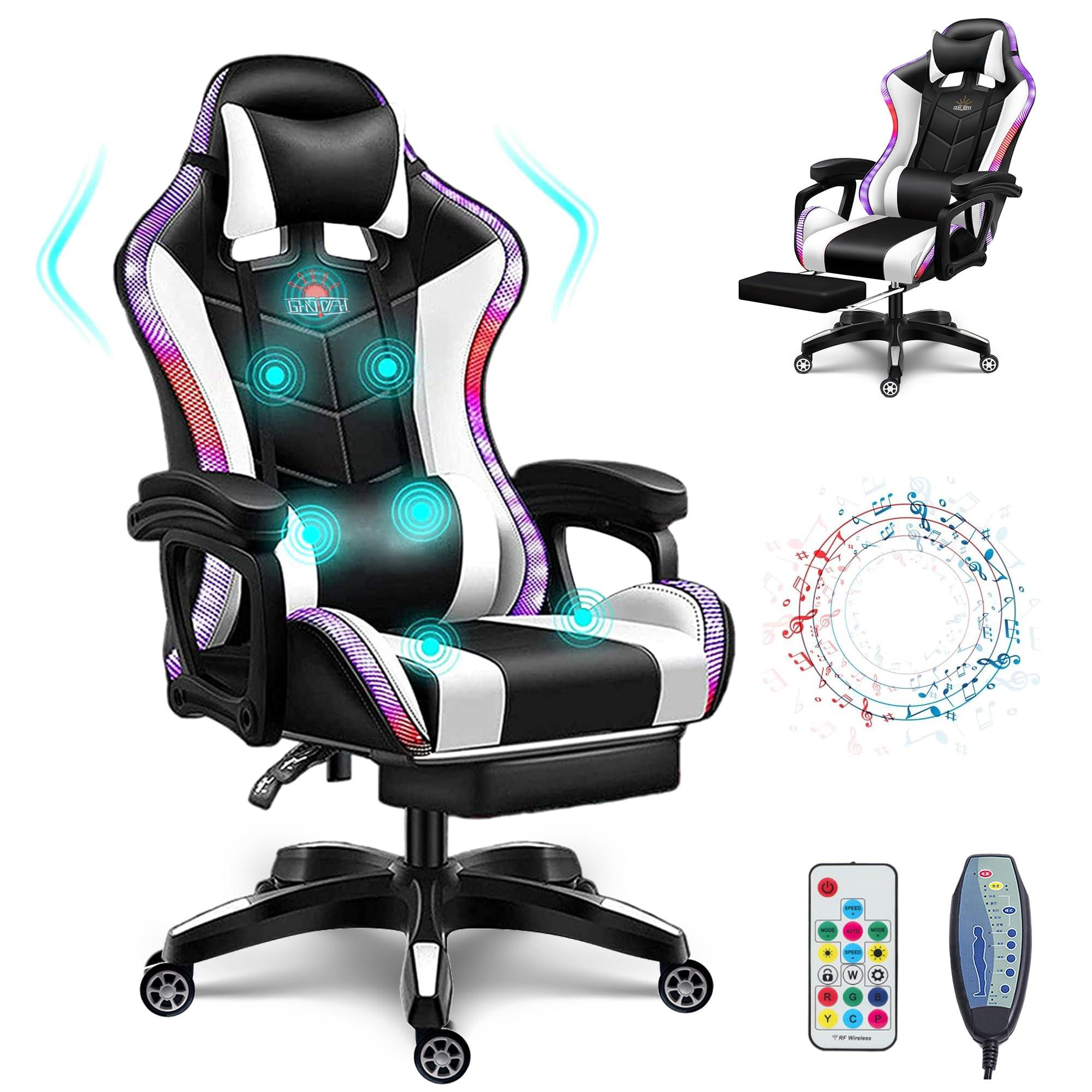 - [VIDEO GAME CHAIRS] The perfect fusion of gaming chair and massage chair. Handle control, seven intelligent massage elements, five massage modes, four massage parts switching, three time controls, and two intensity controls. Allowing you to enjoy the most formal and professional massage therapy while working and entertaining. And the newly upgraded gaming chair adds 3D stereo surround Bluetooth dual audio.