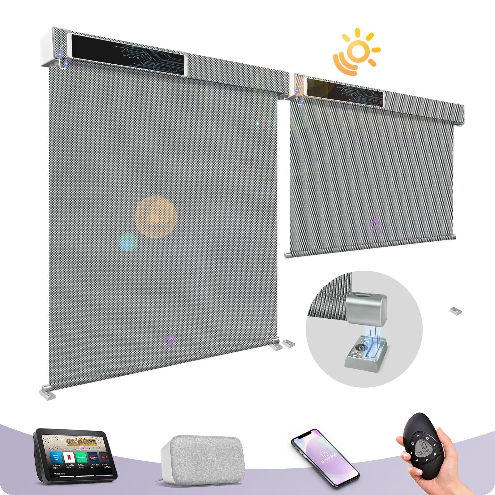 - 2 ways to install & solar powered: 3% openness & 97% UV protection while keep view outside visible and can be installed with wire guides (included) or not, just up to you. The magnetic fixing mode at the bottom makes it easier to roll up and down. What's more, when installed without wire guides, it is safer for kids & pets. Solar powered way offers a lazy, cost-free and green energy solution. Ideal waterproof and windproof smart shades for outdoor patio, pergola, porch etc.