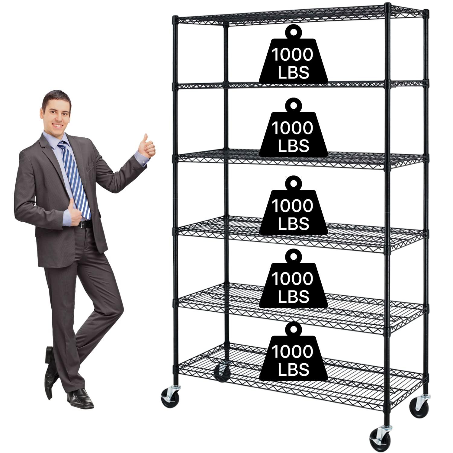 - Sturdy & Durable: Our metal shelves are certified by NSF,which is very sturdy and strong.The 6 Tiers wire shelving unit can take a lot of weight.Each shelf is designed with stiffeners to make it more load-bearing.And the storage rack is made of rustproof and oxidation resistance steel construction, resist dirt buildup and corrosion.Maximum weight capacity per shelf is 1000lbs when equally distributed on feet levelers or on casters.Wire Shelving Storage Rack Metal Shelves