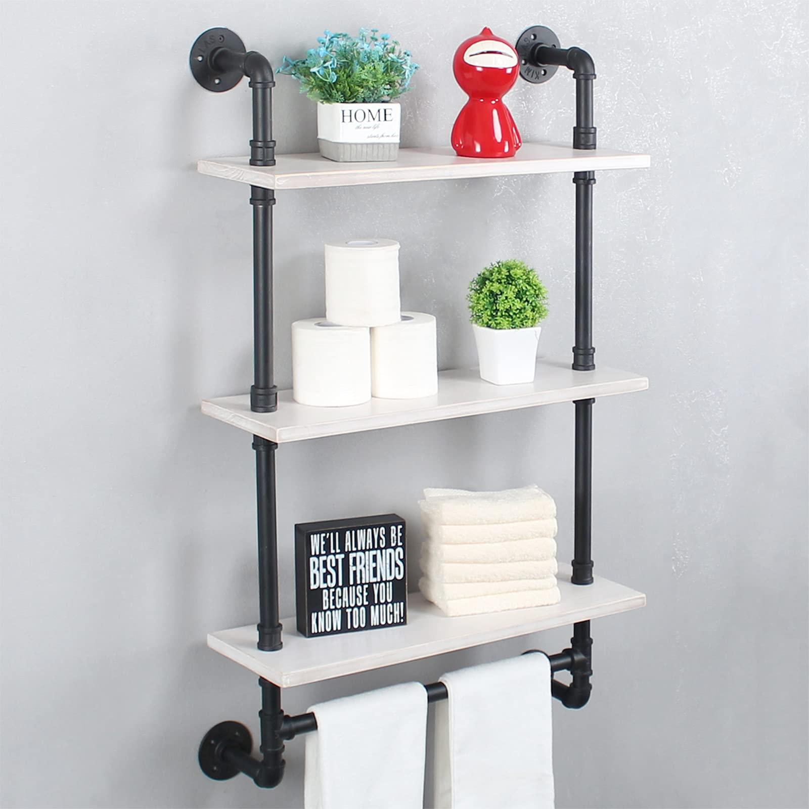 Industrial Pipe Shelf,Rustic Wall Shelf with Towel Bar,24" Towel Racks for Bathroom,3 Tiered Pipe Shelves Wood Shelf Shelving,Black & White