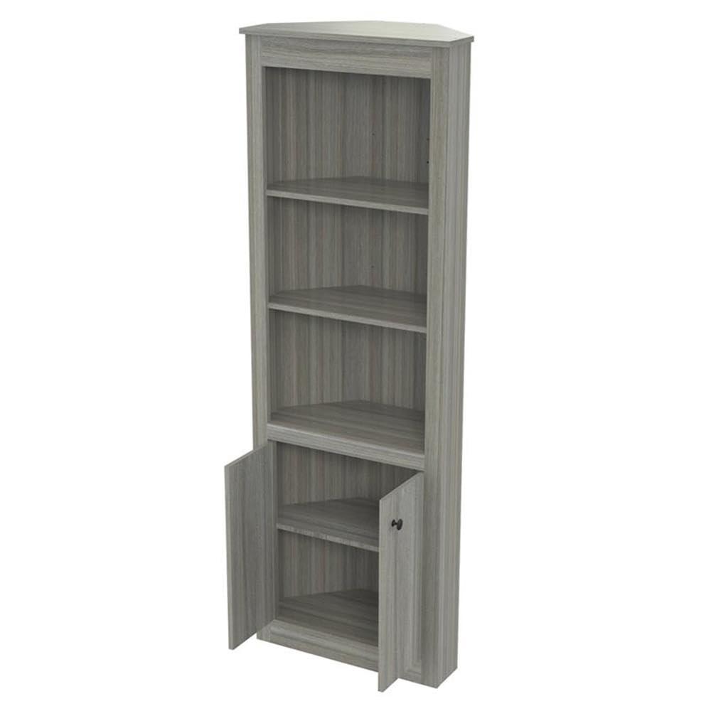 Combining versatility and a modern design, Inval's 2-Door Corner Bookcase will become a great addition to any home or office by keeping your space organized and clutter-free. The three spacious open shelves are perfect for storing and displaying books, magazines, framed photos, decor, knick-knacks, board games, and much more, while the lower 2-door cabinet features two additional storage shelves that provide more discreet storage and help keep clutter out of sight. Constructed from high-quality engineered wood with a melamine laminate finish that is stain, heat, and scratch-resistant, this corner bookshelf withstands years of quality use, and it's conveniently backed by a 5-year limited warranty. The contemporary design and beautiful gray smoke oak finish will look great in any modern home and coordinate well with various ranges of decor styles. This 2-door bookcase measures 70.2H x 24.4W x 11.4D, and its unique corner design fits neatly in any room in your home to make the most of your space.