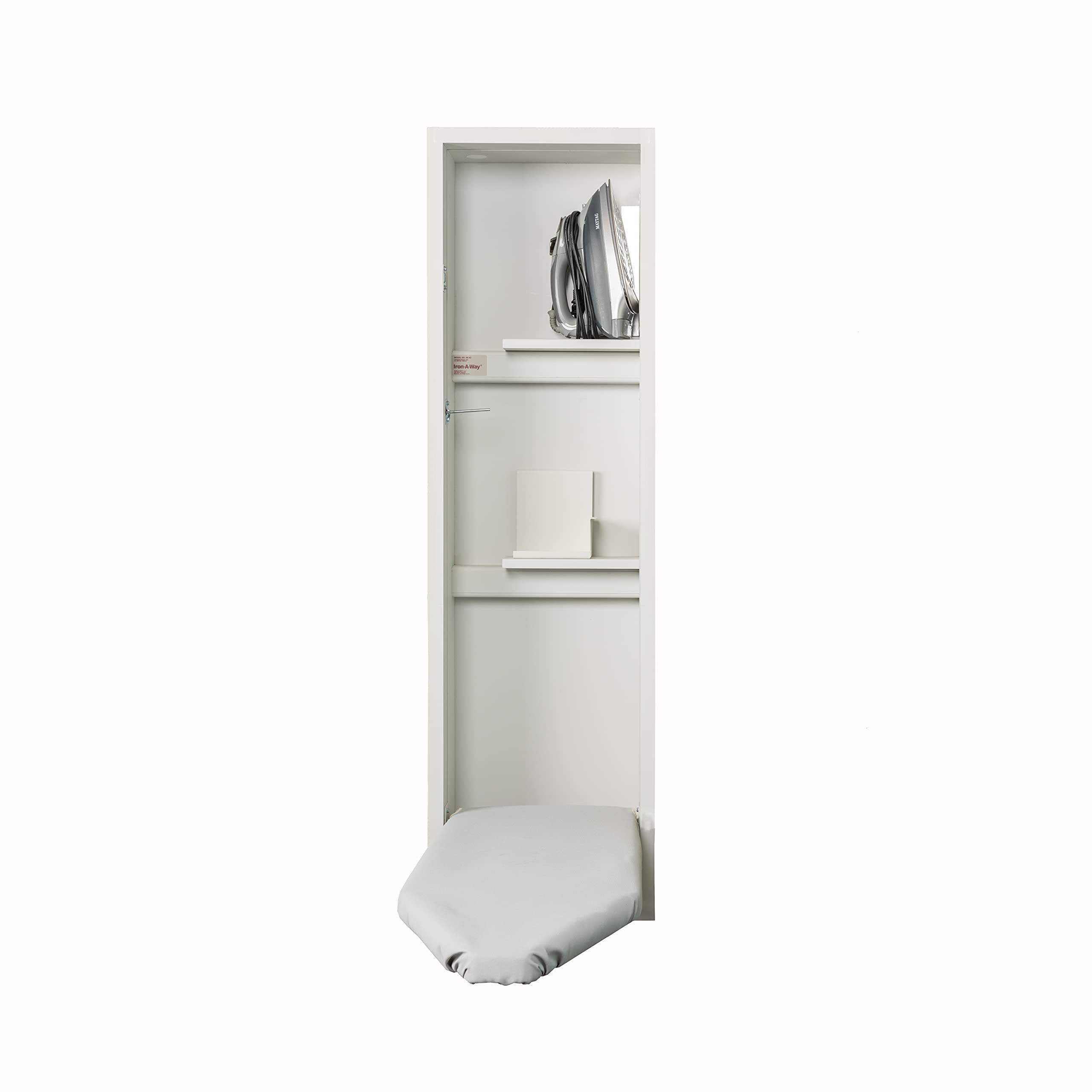 Convenient for locations with a nearby Outlet, the Iron-A-Way non-electrical Ne42 built in ironing center features a fixed position 42 inch fold away ironing board. The deluxe hideaway ironing board is made of rigid, solid ventilated steel, and features an undercarriage that was custom designed for ironing. The board is supported by a single telescoping steel leg, providing outstanding stability. Once finished ironing, store the iron hot with our premium sized hot iron storage area, which holds most irons on the market today. The unit can be wall mounted or Recessed for a flush installation.