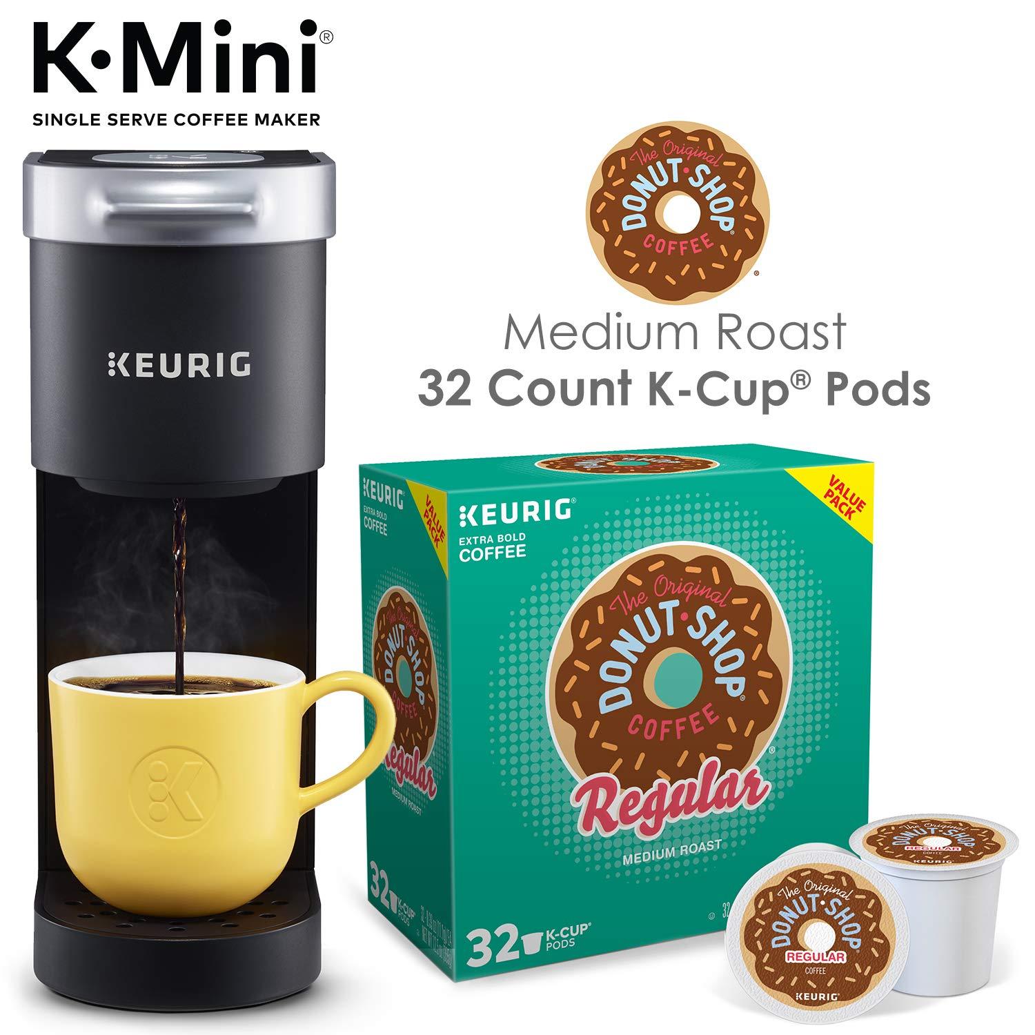 - BUNDLE INCLUDES: Keurig K-Mini Single Serve Coffee Maker in Matte Black and one 32-count box of The Original Donut Shop Regular coffee K-Cup pods.