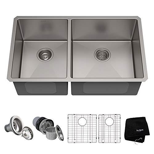 Add an elegant touch to your kitchen with a unique and versatile undermount sink from Kraus Stainless steel sink is a great centerpiece for any kitchen remodeling project Kraus kitchen sink boasts 16-gauge premium grade T-304 stainless steel construction with an 18/10 chromium/nickel composition Scratch-resistant commercial-grade premium satin finish Padded and Stone Guard undercoated insulation over a rubber pad reduces noise while sink is in use Features unique Kraus 0.75-inch radius curved corners for easy cleaning and a stylish look Rear-set 3.5-inch drain opening gives you more storage space 3.5-inch opening is compatible with most garbage disposals available in the market. Please note, Garbage Disposal Flange & Stopper Kit must be purchased separately. Kraus Stainless Steel Kitchen sink comes with: Set of stainless steel bottom grids with protective feet and bumpers Stainless steel basket strainer Stainless steel strainer Dish towel Mounting and installation brackets, cutout template are included 32.75-Inch L x 19-Inch W x 10-Inch H (overall sizes)16.9-Inch L x 17-Inch W x 10-Inch H (bowl sizes)12.9-Inch L x 17-Inch W x 10-Inch H (bowl sizes)Fits 33-Inch cabinet Certified and Listed by UPC, cUPC, CSA, IAPMO, ANSI and SCC Manufactured by KrausLimited Lifetime Warranty