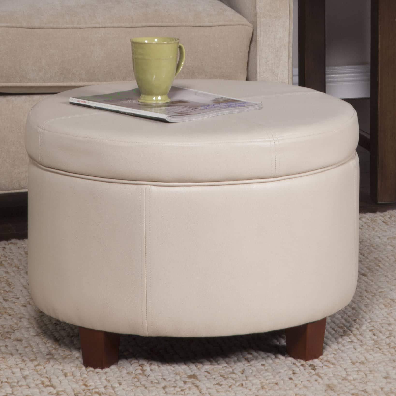 - Ivory faux leather upholstery. Mid-tone brown solid wood legs. Decorative stitching on lid. Center button tuft. Lift-off lid. Large storage capacity. Wipe off clean with warm water. Design/Look: Transitional. Material Info: Faux Leather, Foam, Wood. Type : Storage Ottoman. Pattern : Solid. Print : Solid. Assembly : Assembly Required. Color : Cream. Storage. Shape : Round. Upholstery Material Info: Faux Leather. Product Size: 24.0 In. X 24.0 In. X 17.0 In