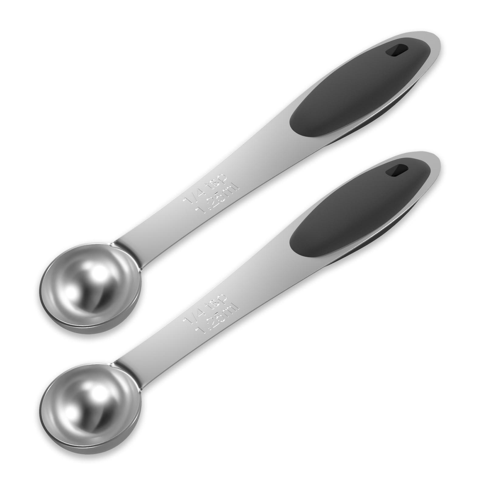 - Clear Engraved Marking The metal measuring spoon have clearly engraved marking in metric and US standard notation (1/4 tsp | 1.25 ml), you can read easily. They are accurate and will never rub off. Perfect solution to cheap plastic measuring sets.