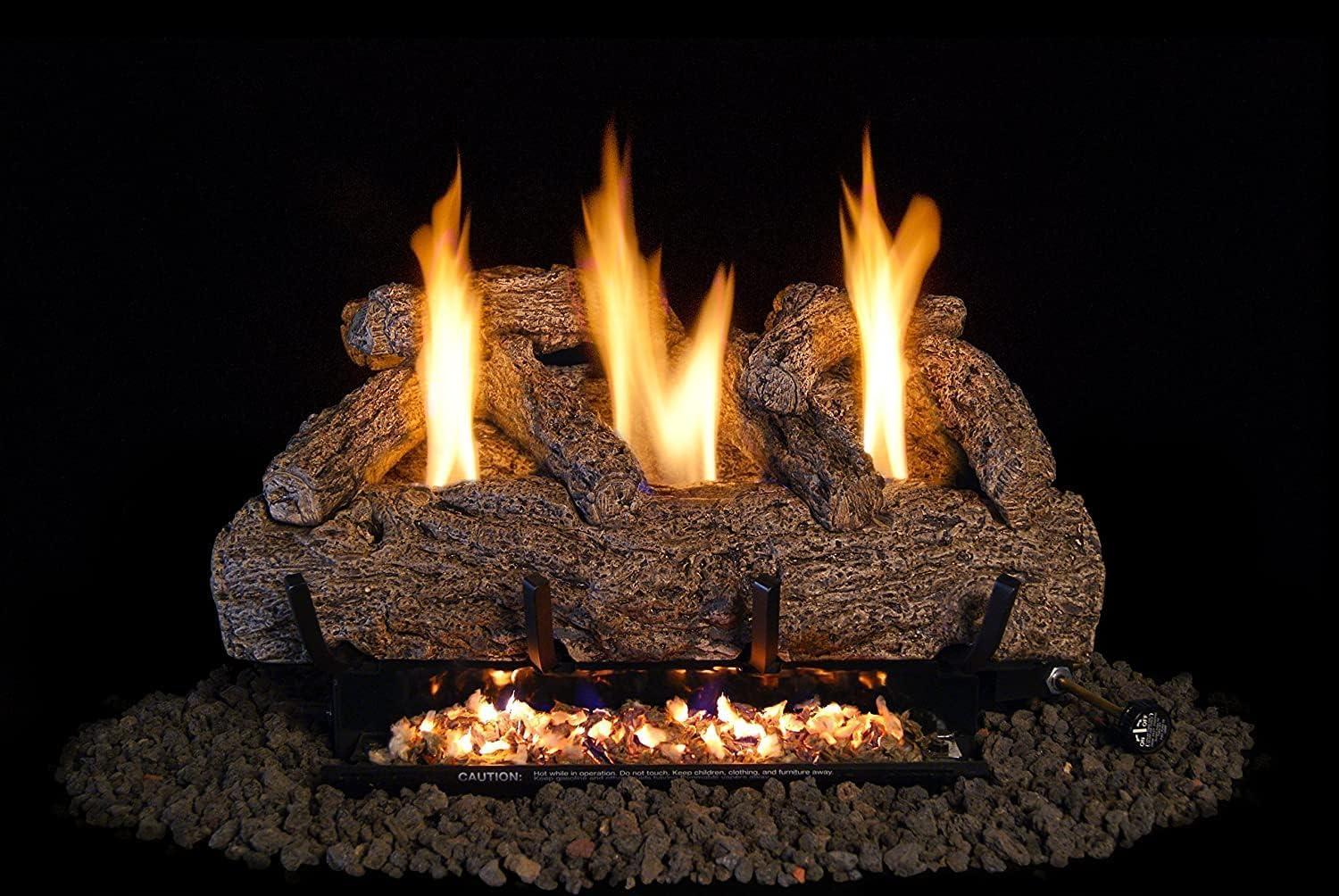Enjoy the beauty, comfort and warmth of our 21 Peterson Fyreside ANSI Certified PROPANE GAS log set with NO VENTING. Advance Technology with a burn efficiency of over 99 Percent allows this Peterson Fyreside (7-Logs) Log Set to be burned with the damper closed. All VENT-FREE sets include authentic wood stack, dancing flames and substantial heat to warm the room. The full natural flames use a minimum of gas, offering money saving fuel efficiency for use in an existing solid fuel burning fireplace, to burn with the damper closed for reliable, supplemental heat This Peterson Fyreside VENT-FREE Log Set includes 7 beautiful Ceramic Refractory Logs, Glowing Embers and New for 2024, Platinum Embers, to provide the realistic look of a real wood burning fire. This VENT-FREE Log Set also comes equipped with an advanced Oxygen Depletion Sensor (ODS) safety Pilot system. The ODS senses the amount of oxygen available in the room and automatically shuts the burner system off before the oxygen level drops below an unsafe level. This VENT-FREE Log Set is also equipped with a convenient On/Off remote control for across the room convenience, from a warm glow of 21,000 BTUs to a Toasty 36,000 BTUs (This Log Set is for Use with (LP PROPANE GAS ONLY) Minimum Dimensions for centering: 28 Wide (Front) 24 Wide (Rear at 14 of depth)