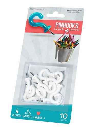 Pin hooks are the new simple and practical solution for hanging items in the home, office, workshop or outdoors. Pin hooks are push pins with a strong plastic hook, that can be quickly and easily inserted into walls, doors, wood, bulletin boards and more, securely holding up to 2 pounds in drywall and 4 pounds in solid wood. Pin hooks get the job done for organizing, decorating or crafting, but only leave a small pin size hole. No mess or hassle with nails, screws or double stick tape. Great for hanging keys chains, jewelry, pet leashes, plastic bags, dish towels, oven mitts, aprons, holiday and outdoor lights, wreaths, party decorations, plant vines and much more. Each Pin hook measures 1.5 in. x .75 in. x .125 in. Made in the USA from durable polycarbonate plastic, with a zinc coated metal pin.