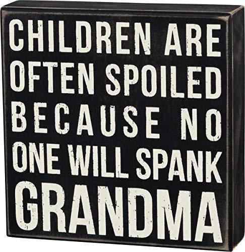 Primitives by Kathy's Spank Grandma box sign is made of Wood and can sit or hang. It measures 7" Square and reads "children are often spoiled because no one will Spank Grandma". Primitives by Kathy is a leading producer of high quality decorative box signs.