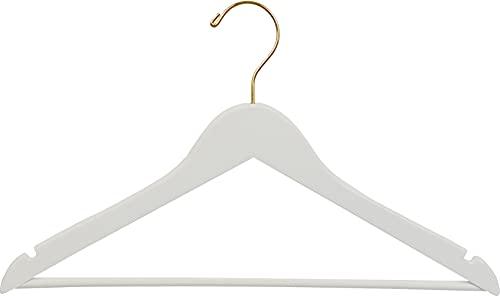The Great American Hanger Company, Wooden Suit or Coat Hangers, Smooth White Gloss Finish Solid Wood Clothes Hanger with Pants Bar. These sturdy, well-constructed hangers are made from premium hardwood. A deluxe hanger ideal for storing and organizing mens or ladies tops, bottoms, coats, suits or uniforms. The high grade suit hangers feature a space-saving flat body shape which removes unwanted bulk allowing maximum closet space for easy organization. Plus, a permanent solid wooden pant bar to hang jeans, skirts, shorts or strapless tops. The two carefully precision crafted notches provide convenience for hanging straps on shirts or dresses. The classic brass hardware is heavy-duty and rust-free. The 360-degree swivel hook can turn any direction to hang men's or women's clothing with ease. Also, the hook will fit on any standard closet or wardrobe bar. Completed with a coating of lacquer for a glossy finish that is smooth to touch but also, prevents splintering or snagging on clothes. These high quality and affordable hangers have been manufactured to last you for years. These white wooden suit hangers will ship in a pack of 50. Dimensions: 17 inch Length x 7/16 inch Thick