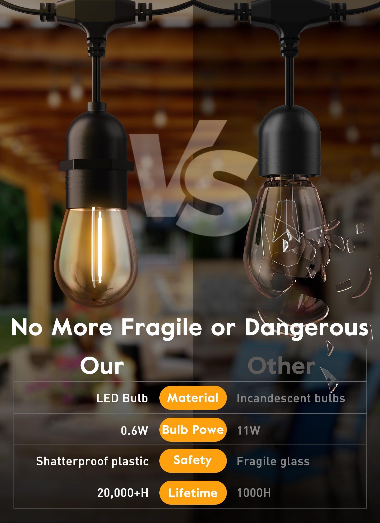 - Dimmable Edison Bulbs: Clear plastic replacement bulbs perfectly combined with strings for a new set of S14 patio string lights. Dimmer compatible edison light bulbs would be perfect decoration lights for your garden, backyard and balcony terrace, they are also an excellent decorative lighting for indoor wedding party