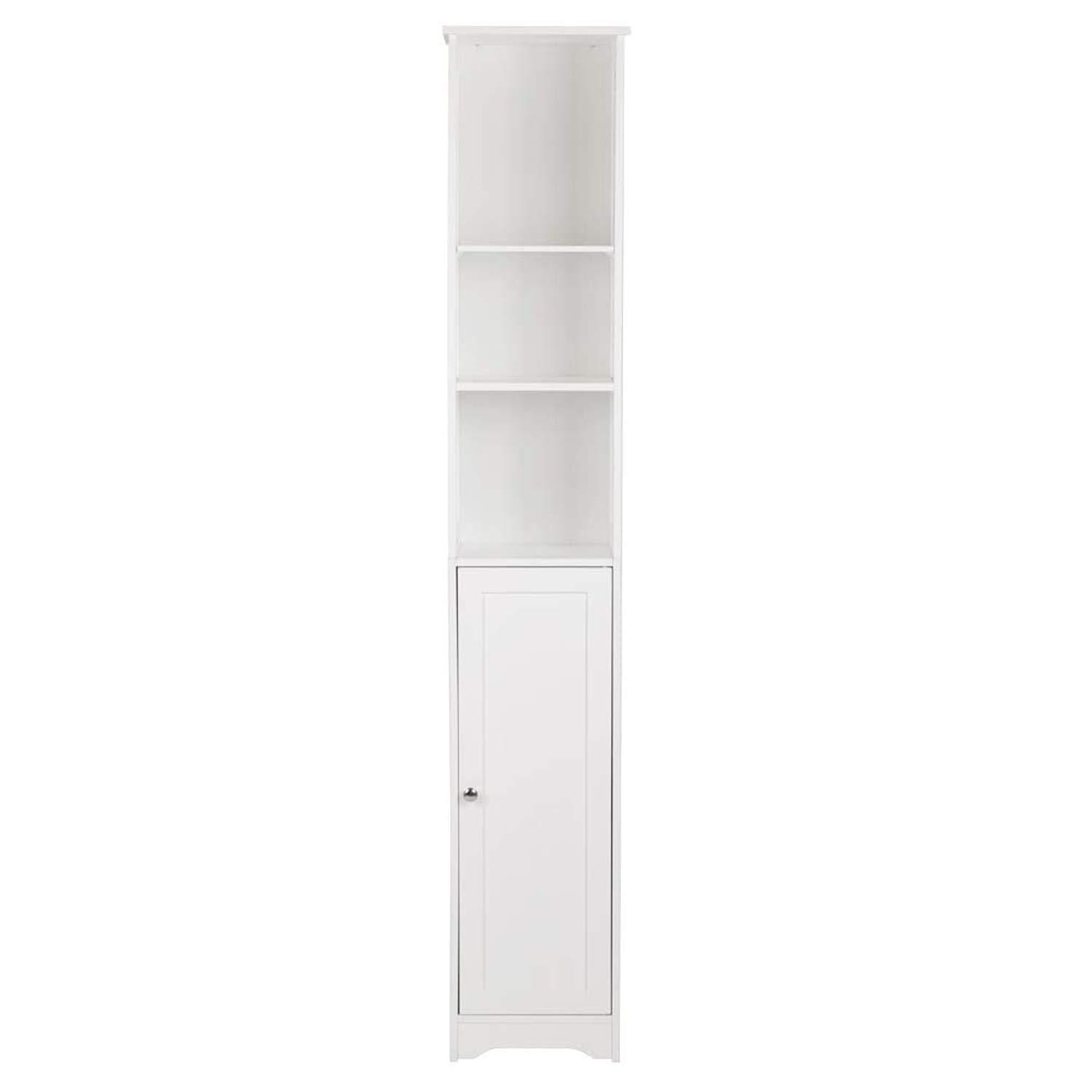 - : This high bathroom tower storage cabinet features with 3 adjustable open shelves and one cupboard with door. It's slender but has ample storage capacity. The slim design is great for using in places short on space.