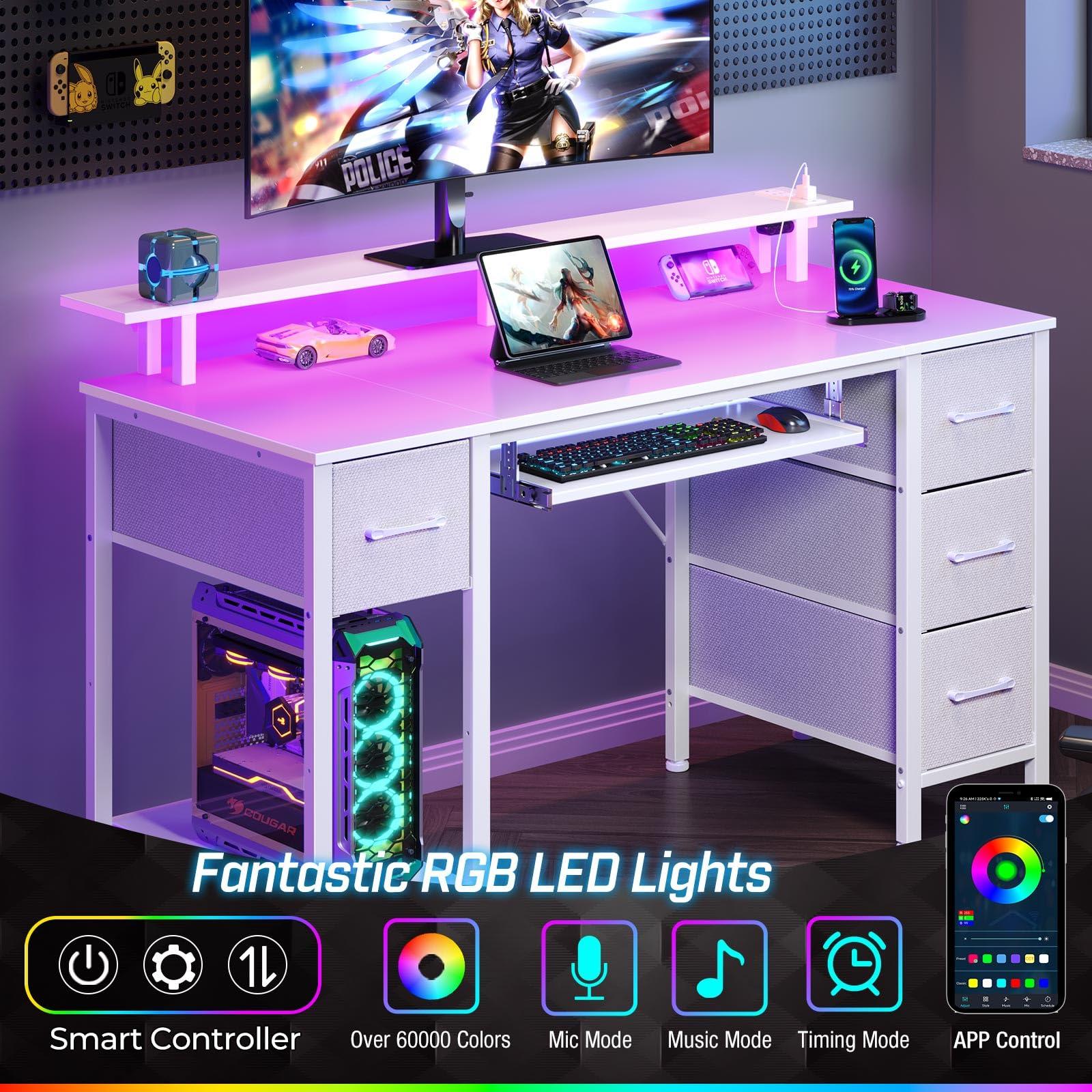- Multifunctional LED: Indulge in the gaming desk adorned with dynamic multi-color RGB LED light strips. Select from a palette of over 60,000 colors effortlessly using the Phone App or controller, allowing you to personalize brightness, color, mode, and timer settings. Moreover, the LED lights synchronize with music, adding an extra layer of entertainment and setting the stage for a dynamic and lively atmosphere