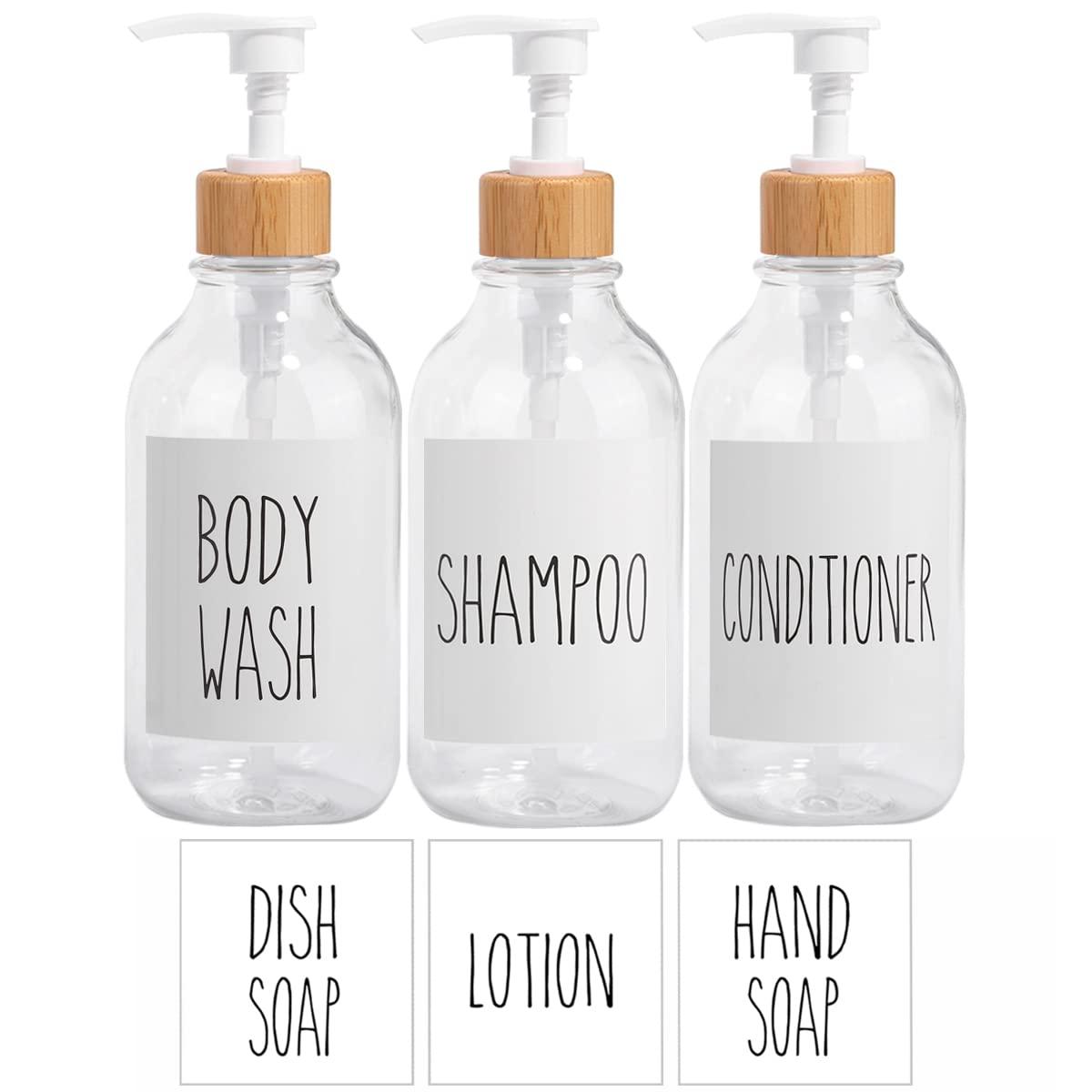 - Multi-function waterproof labelEach set of shower dispenser contains 3 bamboo wood pump head bottles.Each set of refillable shampoo and conditioner bottles is equipped with 6 waterproof labels for clearly identifying the contents, including body wash, hand soap, shampoo, lotion, conditioner and dish soap. These labels are waterproof and durable, ensuring that the label information is not easily worn or blurred.