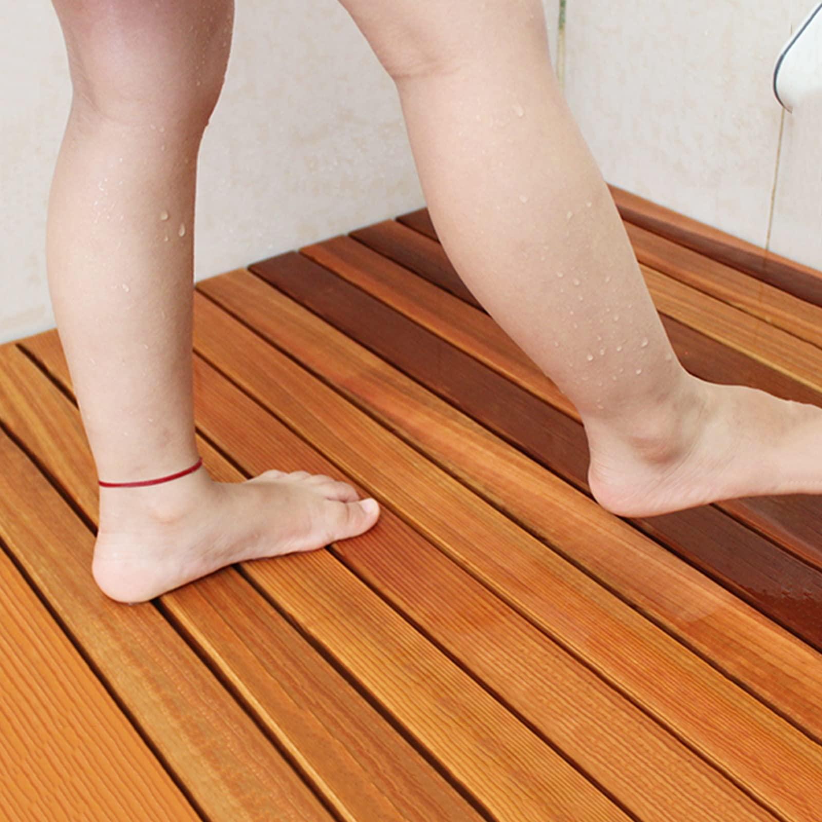 - Non Slip Slats Vented Design: This bamboo wood shower/bath mat prevents hydroplaning, water flows down under the mat and eventually dries up, making the bathroom safer and cleaner.(Water doesn't collect)