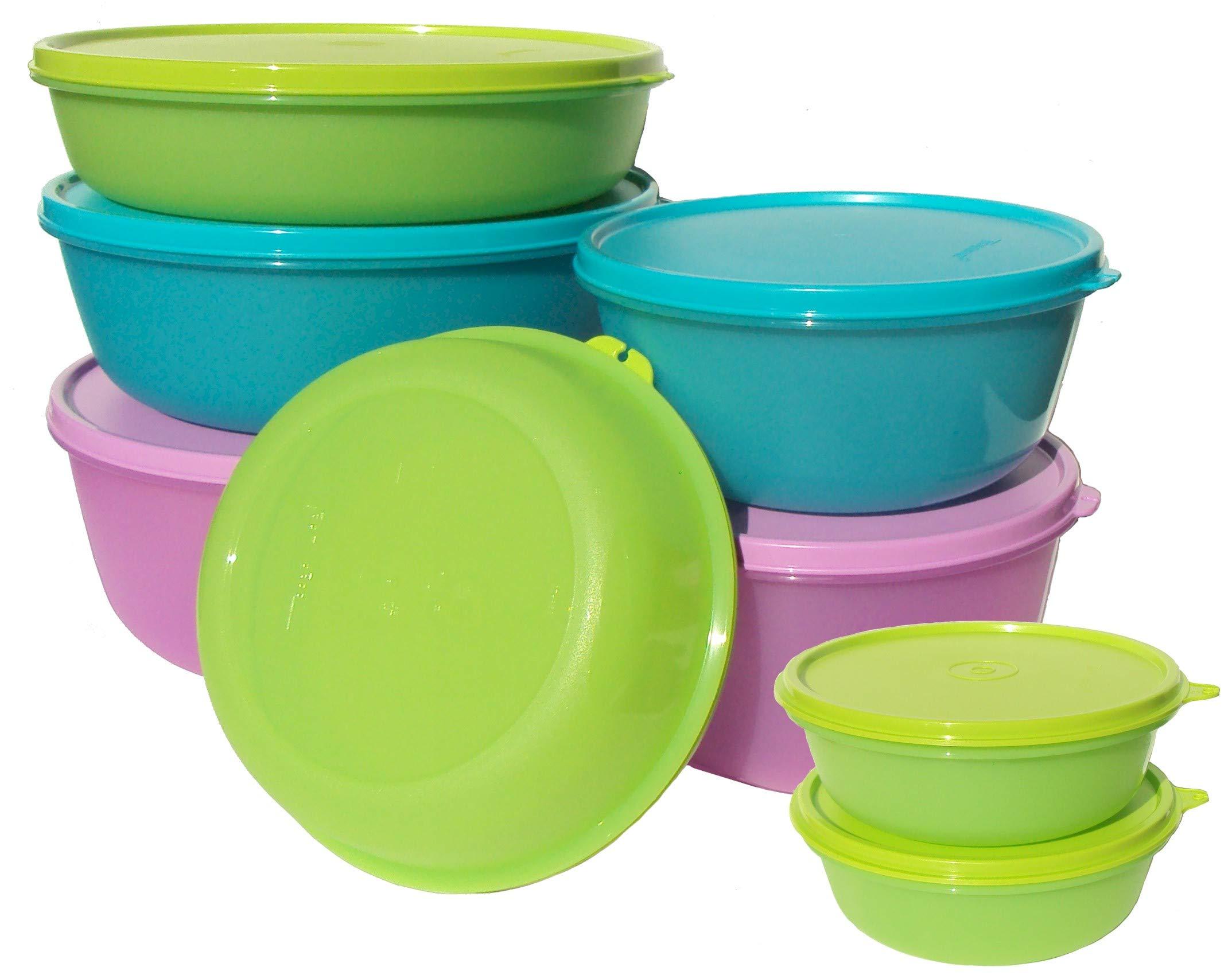 Tupperware Deluxe Modular Nesting Bowls, complete set of 8. Large size set of 3 includes one each that hold 2 quart / 2L, 3 quart/3L, and 4 quart/4L. Medium size set of 3 includes one each that hold approximately 4 cups, 6 1/4 cups, and 8 cups (1L, 1.5L, and 2L). Plus set of 2 individual bowls that hold approximately 2 1/2 cups / 600mL each Bowls nest together and stack atop each other for compact storage. Colors are Daisy, a lavender purple, Tropical Water, an aqua blue, and Salsa Verde, a lime green color. Bowls have a lightly textured exterior with clear panel to see what's stored inside. Virtually airtight, liquid-tight seals. Ideal for serving, storing, and transporting. Dishwasher safe. BPA-free. Not intended for microwave use.